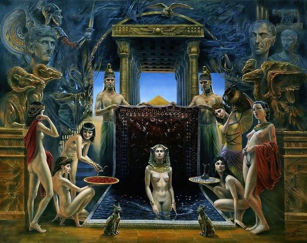 Michael Cheval created "The Lost World," a diptych, where the formal arrangement immediately grabs attention. The composition is split, yet connected, drawing us into a scene that blends the classical with the surreal. The texture of the painting has an organic quality, as though it's grown, not painted. Consider the structure: two nude figures, surrounded by detailed, dreamlike landscapes. These landscapes are punctuated with classical figures and ruins, which might be thought of as signs indicating a cultural and historical narrative. However, the figures are entangled with their environment, blurring the line between figure and ground, nature and civilization. The symmetrical composition is destabilized by the distinct arrangement of figures and landscape elements in each panel. Is Cheval suggesting a binary – past and present, male and female – collapsing into a singular, complex space? The painting becomes a site for exploring how we categorize and understand our world, challenging fixed meanings. Art invites us to continually question and reinterpret.