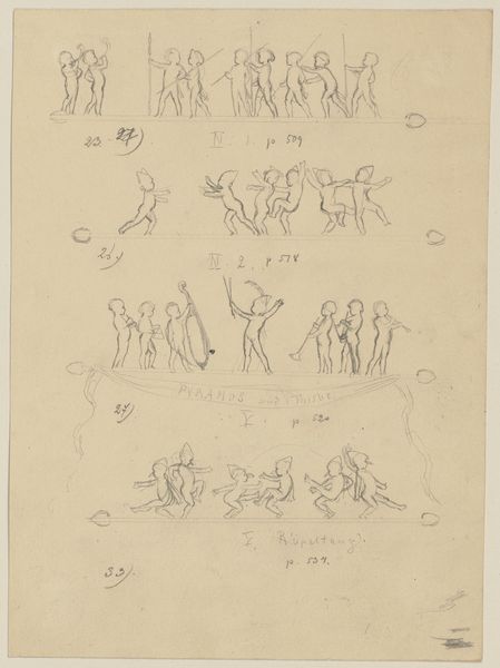 Curator: This fascinating sketch is entitled "Studienblatt: Figuren aus Shakespeares Sommernachtstraum" by Paul Konewka, created around 1867-1868. It's currently held at the Städel Museum. What are your initial impressions? Editor: My eye immediately goes to the visible means of production – the pencil on paper. There’s an immediacy to the line work that speaks to its status as a study. I also appreciate the delicate, almost ephemeral quality the artist achieved with such humble materials. Curator: Indeed. Konewka here is engaging with Shakespeare, adapting and interpreting a popular narrative through his own lens. "A Midsummer Night's Dream" explores themes of love, illusion, and the supernatural, themes that resonated deeply within Victorian society. We can trace the artist's own interpretation of societal constructions and values in his handling of these characters. Editor: And considering the industrial context of the late 19th century, where advancements in printing and mass media began democratizing access to art, this piece makes one consider what sort of societal role a personal drawing like this would serve for the artist or the public that might see it. How labor-intensive were Konewka's projects, and how would they have been displayed and consumed? Curator: That’s an interesting point. I think Konewka draws upon the power of visual representation, contributing to a larger cultural conversation, possibly critiquing social norms. This sheet allows us insight into the processes by which artistic ideas were generated and disseminated, specifically, and in general allows us a deeper exploration of the artistic value behind drawings such as this one. Editor: Right. Considering the social role this plays brings the raw artistic vision into better perspective, grounding Konewka’s art in the material conditions that shape the content it is ultimately about. And of course, thinking about what kind of paper, pencils, or other material constraints that faced the artist while making it can bring another rich avenue of historical questioning. Curator: So, viewing this “Studienblatt,” it serves not only as documentation but as a social mirror, too? Editor: I'd say so. By studying how he translated literature, his working processes, and the material choices behind it, we get to see how broader societal conditions inform artistic meaning. Curator: It is fascinating to me, understanding the socio-cultural roots and underpinnings of art and its intersectional possibilities through an individual’s interpretation of culture! Editor: For me, thinking about its creation shines a bright light on our cultural heritage—and our ongoing relationship to objects.