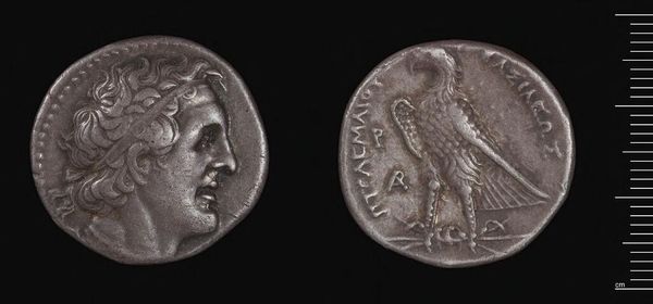 Curator: Here we have a silver tetradrachm, issued by Aesillas during his time as Quaestor in Macedonia, likely around Thessalonike. Editor: The first thing that strikes me is the incredible detail for such a small object, especially in the hair of the figure on the obverse. Curator: Absolutely. That's likely Alexander the Great depicted, deified after his death and a powerful symbol in Macedonia. The reverse shows a club and a quaestor's chair, signifiers of power and office within the Roman Republic, overlaid with the name AESILLAS. Editor: It speaks volumes about cultural assimilation, doesn't it? Macedonian imagery subtly altered to fit within the Roman political framework of the time. The laurel wreath also stands out as a classic symbol of victory and status. Curator: Yes, and that visual blending is precisely the point. Power adapts, but also respects local iconography to maintain legitimacy. A fascinating look at how images are used to negotiate cultural identity. Editor: It really makes you think about what this coin meant to the people who handled it daily, navigating a complex world of shifting allegiances. Curator: Indeed. A small object, but a window into a much larger world.