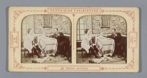 Curator: This is a stereoscopic image by Liberty Brand titled "Oh What a Difference in the Morning." It's quite small, just 7.5 by 7.5 centimeters. Editor: It feels very intimate, a glimpse into a private, domestic space. The way the figures are positioned in bed suggests a narrative, perhaps of illness or recovery. Curator: Stereoscopic images were mass-produced, a form of accessible visual consumption. The text on the card indicates it was part of a "New Educational Series," blurring lines between entertainment and didacticism. Editor: The title itself is intriguing. It hints at broader societal attitudes towards health, labor, and the roles assigned to individuals within the domestic sphere. I wonder, what kind of difference were they trying to portray? Curator: Precisely. It prompts us to consider the social contexts and the labor involved in producing and circulating these images. Editor: Ultimately, it’s a reminder of the stories embedded within everyday objects, inviting us to question the narratives they present.