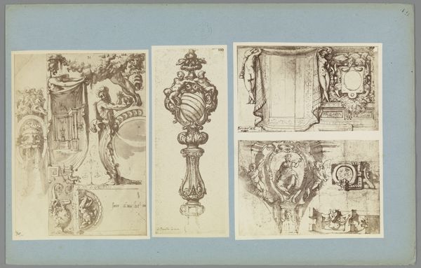 Curator: Well, isn’t this fascinating? We’re looking at a set of three photographic reproductions, capturing drawings and prints of architectural elements. They were likely created between 1875 and 1900. Look at all that detail! Editor: It’s funny, the initial impression is almost like a Victorian-era scrapbook. Fragmented, obsessed with details... like they're trying to hold onto something crumbling away. Curator: That's a brilliant take. You know, I see these as documents of a very specific cultural moment—a revival of classical ideals manifested through architecture and ornament. Think about the late 19th century—the rise of industrialization, but also a yearning for the grandeur of past empires. Editor: Totally. I can feel the Neo-classical vibes strong here. That relentless pursuit of symmetry and proportion, trying to inject order into a chaotic world, maybe? But what’s striking is that they're reproductions of drawings of prints—layered artifice upon artifice. Like a memory fading through copies. Curator: Exactly. Photography democratized access to these architectural motifs. Suddenly, you could study the details of a Corinthian capital without traveling to Rome or Athens. It becomes part of the visual language accessible to a much broader audience, influencing building design globally. Editor: Still, there’s an inherent melancholy to it, right? These stark photographs, stripped of color, feel almost clinical in their examination. What were the buildings that inspired these elements actually like? It’s just shadows of grandeur… ghosts of buildings. Curator: The absence of an identified artist speaks volumes, doesn’t it? Perhaps the photographer was an apprentice studying different drawing and printing techniques or even styles from classicism or realism as shown here. Or simply someone keen to archive these design ideas at scale. Editor: Makes me wonder, were these photographs intended as practical aids for architects, a historical archive, or something more… wistful? Something about lost beauty and forgotten dreams. Curator: Possibly all those things, blended together! It reveals that in observing fragments of the past, we are perhaps simultaneously capturing something about ourselves, our preoccupations. A mirror, perhaps, reflecting our ongoing search for meaning in what we choose to document and how we remember it.