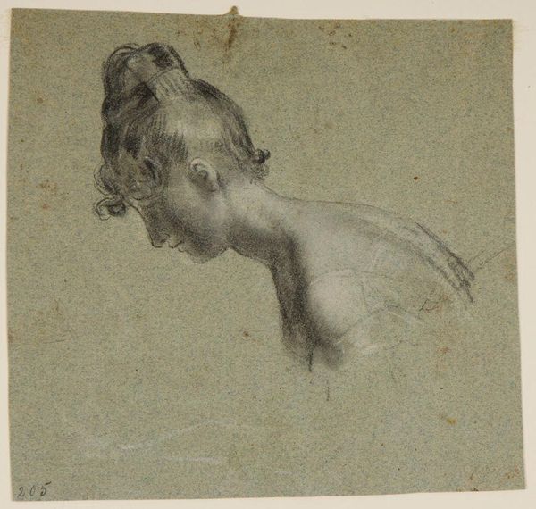 This is Agnolo Bronzino's "Man's Head from the Back," a drawing rendered with sanguine on paper. The eye is immediately drawn to the back of the neck and head, with a focus on the curvature of the skull and the sinuous waves of the hair. The limited color palette, primarily warm reddish-brown tones, creates a sense of depth and volume through the use of light and shadow. Bronzino masterfully employs line and form to capture the human figure. The detailed rendering of the hair, with each strand carefully delineated, contrasts with the smoother, more generalized treatment of the neck and shoulders. This contrast invites us to consider the semiotic weight of each element. The hair, often a symbol of identity and beauty, is given prominence, while the anonymity of the figure challenges traditional portraiture. The composition, isolating this fragment of the body, speaks to broader philosophical concerns about identity, representation, and the gaze. Ultimately, "Man’s Head from the Back" becomes an intriguing study in form and meaning, inviting us to look beyond the surface and contemplate the complexities of human representation.
