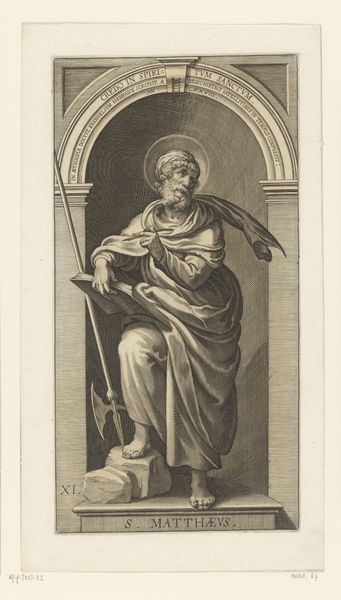 This is an engraving of Numa Pompilius, the legendary second king of Rome, made by an anonymous artist. Consider the weight of representing leadership; this image asks us to ponder how power is visualized and understood. Pompilius is adorned with symbols of authority, yet there’s a striking contrast between the divine claim to power and the very human face of the ruler. How does the artist, in their anonymous position, negotiate the complexities of depicting a historical figure who embodies both myth and political power? We can see how images like this play a crucial role in constructing and perpetuating historical narratives. Pompilius is not merely a man but an idea, shaped by the cultural and political needs of the time. Reflect on the act of looking and interpreting, and how we, as viewers, participate in the ongoing dialogue between the past and the present.
