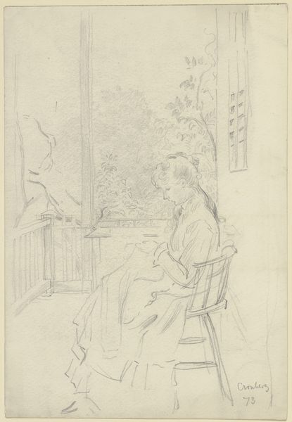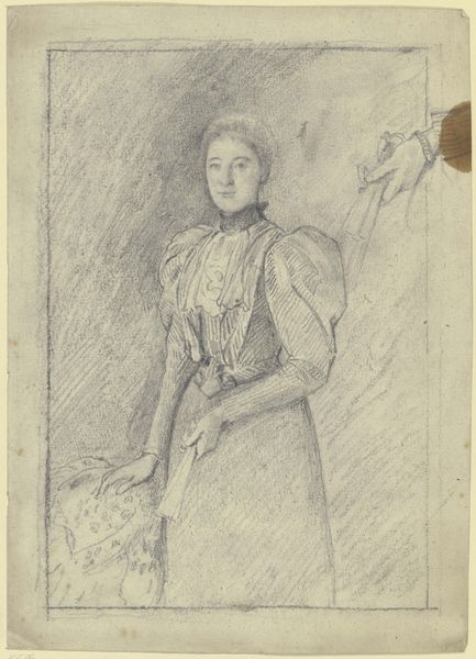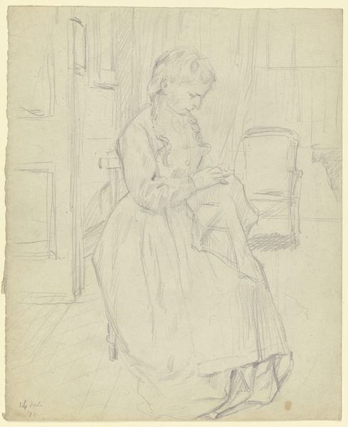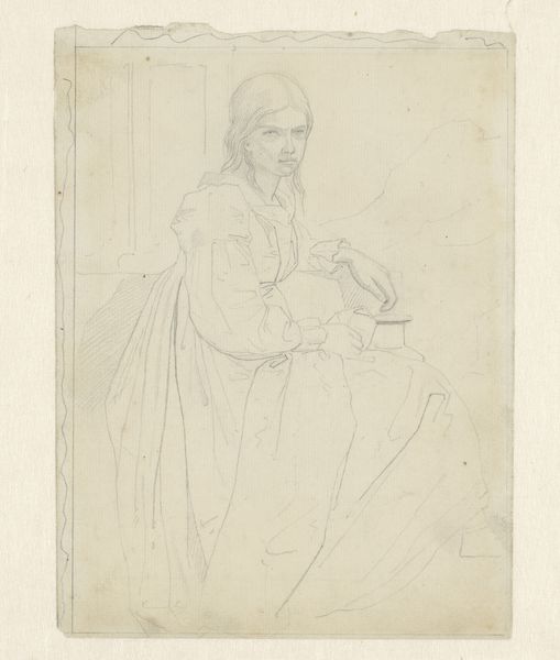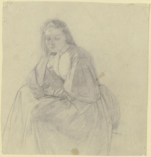 Otto Scholderer made this pencil drawing, titled "Luise Scholderer am Tisch sitzend," capturing a moment of domestic tranquility. Scholderer, who was born in 1834, lived during a time of significant social change and artistic development. Here, we see a woman, presumably Luise, seated at a table, her hands clasped gently in her lap. The setting is intimate, with a teacup and other small objects suggesting a quiet, personal space. It’s interesting to consider the roles available to women of this era, often confined to the domestic sphere, and how Scholderer portrays Luise within that context. What does it mean to capture a woman in a moment of repose? Is it a celebration of domesticity, or does it hint at the limitations placed upon women's lives? This drawing invites us to reflect on the intersections of gender, class, and the quiet moments that define our personal experiences.