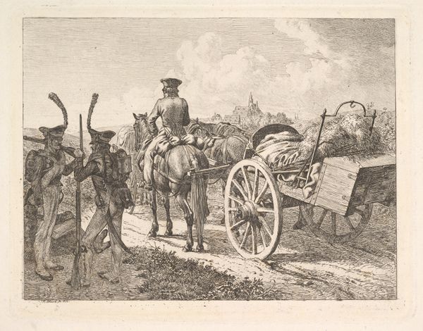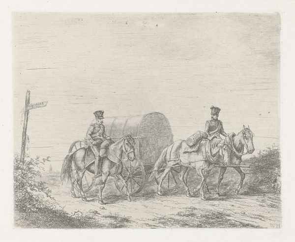 This etching by Christiaan Wilhelmus Moorrees depicts two soldiers on horseback, pulling a wagon along a path towards Roosendaal. Observe the horse, a symbol deeply embedded in the human psyche. From the steeds of classical gods to the warhorses of medieval knights, the horse represents power, freedom, and virility. Here, these horses are tamed, harnessed to a mundane wagon, their powerful symbolism muted by military duty. Yet, the echo of their wilder counterparts persists. Consider the recurring motif of the horse in art – from the dynamic energy of Delacroix’s romantic depictions to its representation of unbridled passion in mythology. Even here, in this relatively unassuming scene, the subconscious recognition of the horse's primal energy engages us, stirring a deeply rooted fascination with its untamed spirit. The symbol of the horse continues its cyclical journey through history, adapting to new cultural landscapes.