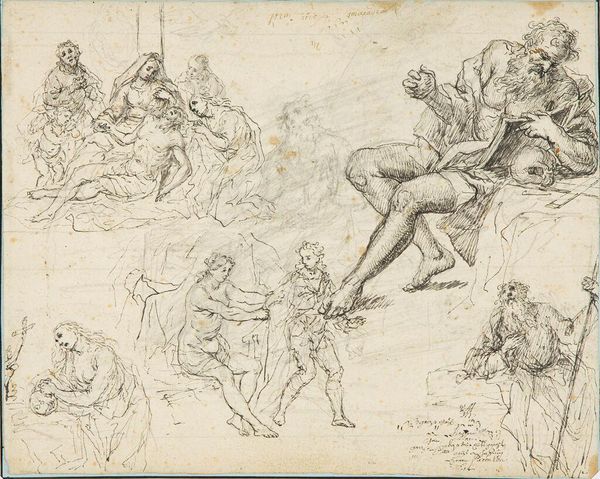 Bernardo Castello sketched these various figures in pen and brown ink on laid paper. Active in Genoa during the late 16th and early 17th centuries, Castello navigated a world where artistic expression was deeply intertwined with social status and religious norms. The sketches offer us a glimpse into the Renaissance era's fascination with the human form, particularly the male nude, often idealized and imbued with heroic qualities. Here, Castello seems to explore themes of power, vulnerability, and perhaps even homoerotic desire, through the poses and relationships between the figures. Consider the seated warrior, juxtaposed with other figures in various states of undress and repose. How do these images reflect the complex interplay of gender, sexuality, and class in Renaissance society? Ultimately, Castello's sketches invite us to contemplate the enduring human concerns with beauty, strength, and the search for identity.