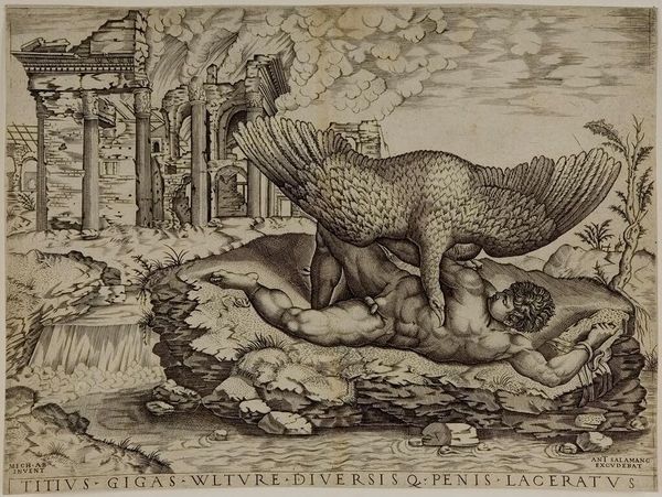 Editor: We’re looking at “Tityus and the Vulture,” an engraving by Nicolas Beatrizet, created sometime between 1525 and 1565. It depicts a large bird of prey consuming a nude man’s liver, all set against a backdrop of ruined architecture. The scene feels both dramatic and gruesome. What resonates with you most when you look at it? Curator: Immediately, I am drawn to the vulture, its form practically swallowing Tityus. This image echoes not just the Greek myth, but enduring anxieties around transgression and divine retribution. The vulture, an almost primeval symbol of death and decay, becomes a physical manifestation of Tityus's eternal punishment for his attempted rape of Leto. How does the ruined architecture behind them inform this? Editor: It looks like even grand structures eventually crumble. It adds a layer of commentary about fleeting glory to the theme of eternal punishment. But why frame a personal punishment in such a grand, historical setting? Curator: Consider the ruins themselves. They symbolize not only lost empires but perhaps also the crumbling moral foundations of society. The tale of Tityus, framed by these ruins, transforms into a cautionary allegory about overreaching ambition and the consequences of hubris. What emotional chord does it strike in you personally? Editor: It's the futility of Tityus's struggle. Even with his strength, he’s powerless against the divine and the endless cycle of torment. Curator: Precisely. Beatrizet uses powerful symbols to show us not just a scene from mythology, but an enduring truth about human limitations and consequences of our actions. A story still told in visual cues across eras, if you only learn the symbolic language. Editor: That's fascinating. I didn't realize how many layers of meaning were embedded within what initially seemed like a straightforward depiction of a myth. Curator: It reminds us that images often speak in a visual vocabulary; each element meticulously chosen to carry cultural weight and reinforce underlying messages. A valuable reminder about what to look for.