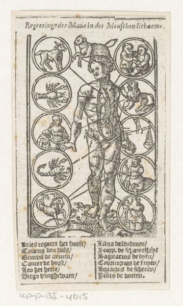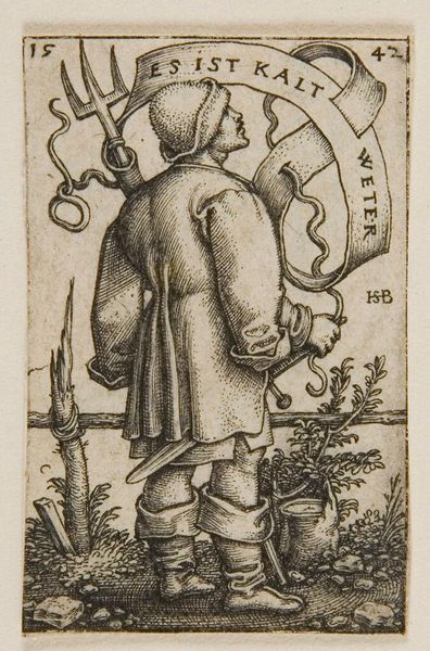 Curator: Gosh, this print is making me shiver just looking at it. Editor: That would be Sebald Beham’s engraving, "The Weather Peasant: 'Es ist Kalt Weter'," created in 1542. It's small but powerful. What catches your eye initially? Curator: Well, first, it does seem pretty cold. I can practically feel the biting wind, looking at that guy’s turned-up collar. Beyond that, the contrast – it feels a bit bleak, doesn't it? Somber. The stark lines create a sense of austerity. Editor: The stark lines are part and parcel of the engraving technique. Beham masterfully employs them to create tonal variation and texture. Note the meticulous details of his garments, tools and background landscape. The figure holds a banner. Can you decode its importance? Curator: Is the "Kalt Weter" banner some kind of commentary on the peasant’s lot? A symbol, perhaps? I’m curious to think more about it. What's he actually doing? Is he complaining about the weather, resigned to it, or defying it, sword in hand, and tools slung over his shoulder, as if he’s heading off to war against winter itself? I do think he has this attitude. Editor: Your suggestion is persuasive! The juxtaposition of his agricultural tools—a pitchfork—with a sword is, in itself, semantically potent. Consider how it echoes ideas about rural life during that period, likely touching upon labor, survival, and, yes, even resistance to circumstances and potentially feudal exploitation. Curator: That's deep! And very relevant considering the Northern Renaissance context of this engraving, when there was great class conflict! All captured in this tiny frame! Even today, the image brings you in and it’s as if you were standing there next to him feeling the same cold of that time. Editor: Precisely. It exemplifies how visual forms condense and express socio-historical layers beyond their immediate representation, inviting us to read more critically into even the seemingly simple scenes. A perfect encapsulation. Curator: Yeah, I’m really gonna need a hot cocoa now. Thanks for your insight! Editor: A worthwhile endeavor indeed. Perhaps that "Kalt Weter" won't seem so severe when we engage actively with how such artists translate their times into enduring images.