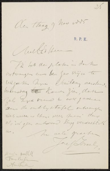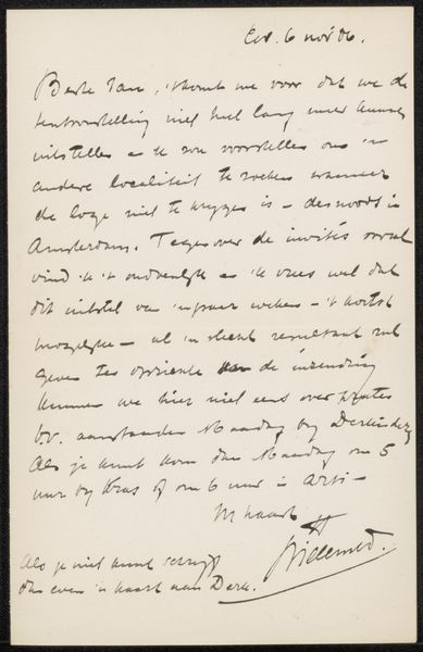 This letter was written in 1901 by Jozef Israëls in The Hague, using paper and ink. A seemingly unremarkable combination, yet it is through these humble materials that we gain insight into the artist’s world. Consider the paper itself, likely mass-produced, reflecting the rise of industrialization. The ink, carefully applied with a nib pen, showcases the artistry involved in handwriting, a skill honed through years of practice and education. The letter format suggests a social network sustained through the labor of writing and postal delivery, connecting individuals across distances. The act of writing, the selection of words, and the formation of each stroke all contribute to the meaning conveyed. It invites us to consider the networks of communication that sustained the art world, and the value placed on personal connection in an era of increasing industrialization. By attending to the materials and means of production, we recognize how this simple letter operates within broader social and cultural systems.