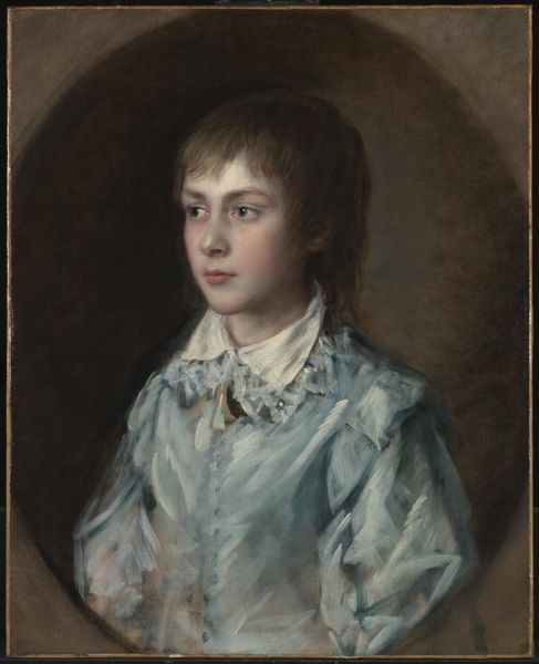 Curator: This is James McNeill Whistler’s “Blue and Coral; The Little Blue Bonnet,” painted in 1898. The oval shape is quite striking. Editor: The impasto is pretty thick, isn't it? Especially around the ruffled collar and that almost violently scribbled area just off the left side of the girl’s chest. It feels both delicate and haphazard. Curator: It reflects a shift in late 19th-century art. We’re moving away from strictly academic portrayals and seeing more personal interpretations, Impressionistic techniques used for more than just landscapes. It is a departure and acceptance of imperfection, even within portraiture, that is exciting. Editor: I am most drawn to the child’s gaze—level, unflinching—which invites a particular sense of vulnerability. You can really sense how the textures create that interplay between presentation and feeling, what her ruffles and adornments may try to convey versus what she shows. It raises many interesting questions about the materials of identity. Curator: And Whistler had a fascinating understanding of identity, performing the role of artist-dandy, battling with critics, cultivating a specific image through the social sphere. He truly embraced the spectacle and politics of being an artist. This contrasts with the domestic presentation of the model—possibly a professional model in an arranged tableau? Editor: Looking closely, you can almost feel the push and pull of the brushstrokes building the form, see the hand of the artist. Consider the economic backdrop of materials and modeling during this period... Curator: It’s tempting to wonder, who *was* the intended audience? Was it painted as an intimate work, as the subject’s direct connection to the viewer suggests? Or was this an intentional painting meant for public view—meant to capture the fleeting effects of natural light and to show his modern abilities? It invites so many different views of the history of portraits! Editor: It’s precisely this sort of ambiguity in execution that continues to invite viewers into an intimate relationship with the subject and art itself, isn't it? Even after so long. Curator: Indeed. And perhaps what appears straightforward initially reveals layers upon deeper reflection.