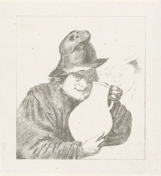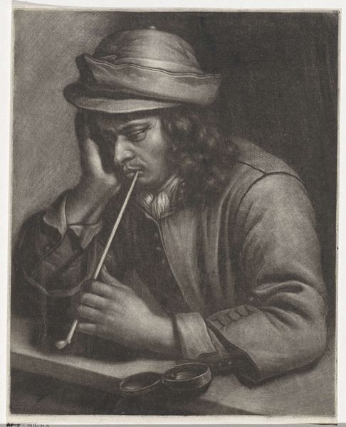 This is an etching titled "Pijprokende man," or "Man Smoking a Pipe," made by an anonymous artist, printed on paper. The printmaking process has a lot to do with how this image looks. The artist would have covered a metal plate with a waxy ground, then scratched an image into it with a needle. Immersed in acid, the exposed lines would be eaten away, leaving grooves that would hold ink. The plate would then be wiped clean, and pressed against paper, transferring the image. Look closely, and you can see that the whole image is built up from lines. The tonal gradations depend on how closely these are packed together. It's an indirect process, which creates a certain distance, but also a kind of precision. Printmaking, like all forms of production, has its own qualities. It invites us to consider not just the image, but the method by which it was brought into being.