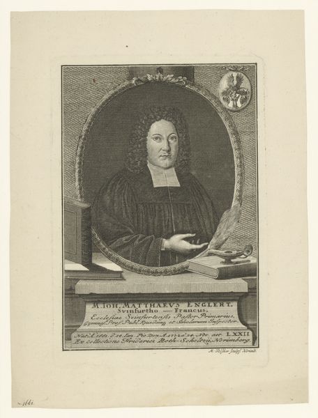 Curator: This is a print, an engraving dating from sometime between 1665 and 1721, titled "Portret van Bernhard Sanden." It’s a baroque portrait of Christian Romstet. The detail achieved through the engraving is impressive. Editor: It is, and there is such intensity in his eyes. What draws your attention when you look at this print? Curator: Well, for me, understanding the subject, Christian Romstet, situates this portrait within a particular historical and political landscape. As a pastor, his image is tied to the religious and intellectual conflicts of the era. Editor: You mean the tension between religion and politics? Curator: Exactly. Consider how the artist uses visual cues—Romstet's somber dress, the inscription surrounding the portrait—to signal authority and piety. The portrait operates as a form of propaganda, reinforcing his position and message within a society grappling with reformation and evolving religious doctrine. How does that perspective affect your understanding of the "intensity" you mentioned earlier? Editor: That shifts it a lot! I saw personal intensity, but understanding his position in society, that intensity could be commitment to a specific doctrine, even defiance. Curator: Precisely! And the "historical fashion," as it's tagged, further roots him in that specific cultural moment. Recognizing the societal context allows us to see the portrait as more than just an individual likeness. Editor: That’s a good point, to think of his dress code, which isn't necessarily of his personal style. So thinking about context helps reveal these hidden narratives. Curator: Precisely. And it helps us to have an opportunity to draw lines between history, identity, and faith.