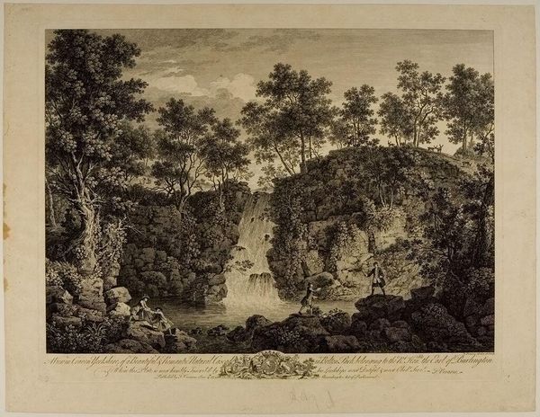 Curator: Francois Vivares' "Landscape with Narcissus," currently held at the Harvard Art Museums, presents a classically-inspired scene rendered with delicate etching techniques. Editor: It feels so staged, almost theatrical. The figures are posed, and the landscape feels like a backdrop. Is it trying to convey some specific social or moral message about vanity? Curator: Perhaps. Consider the printmaking process itself. Prints like these were vital for disseminating images and ideas. The availability and affordability democratized access to such scenes, potentially influencing broader cultural tastes and values. Editor: That's interesting. So, it’s not just about the myth of Narcissus, but also about the print's role in circulating that narrative within a specific social context. I now see that the commodification of this scene through prints added another layer to its meaning. Curator: Exactly. By examining the means of production and distribution, we uncover how art participates in shaping cultural understandings. Editor: Knowing that, the piece feels less like a simple illustration and more like a cultural artifact reflecting its time.