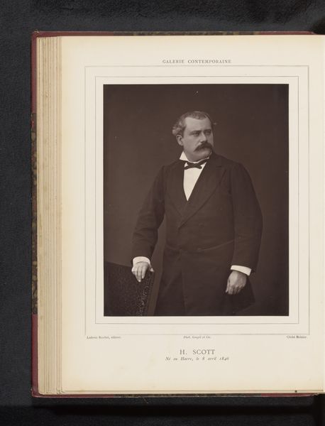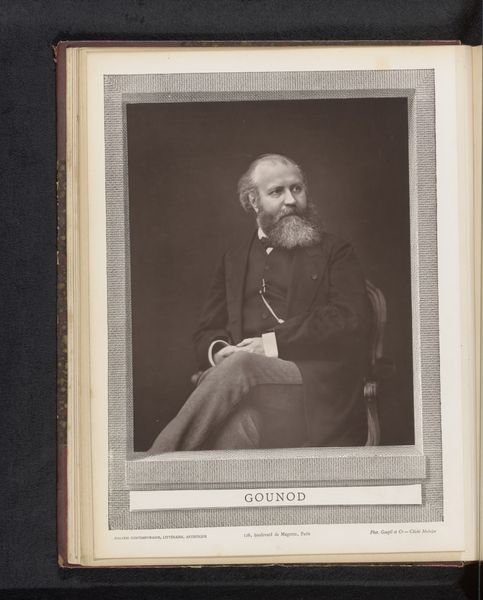 Editor: We are looking at "Portrait of Jules Simon" by Etienne Carjat, a gelatin silver print made before 1877. The image is part of an album page, complete with a decorative border. It's a rather dignified portrait, almost austere in its presentation. What catches your eye when you look at this? Curator: What's interesting is how photography like this, newly accessible, influenced the public's perception of political figures. Carjat was a known caricaturist. How do you think his background may have affected his photographic portraits? Editor: That's a clever point! Perhaps he was subtly skewing the images, or maybe his subjects felt they needed to appear especially serious to counteract any potential for ridicule? I hadn't thought of that. Curator: Precisely! Consider the role of the *salon* and other public arenas in shaping the image of prominent men like Simon. Carjat likely understood the performance of status that these photographs perpetuated, playing with ideals of Republicanism with his printing practice. Editor: The word 'performance' resonates strongly here. It suggests how actively people cultivated their images in this era, when photographs were circulating more widely than paintings had done, becoming a primary way for politicians to be known. Curator: And who controlled that distribution mattered enormously. Think of how journals reproduced and commented upon images such as this one and influenced the electorate and academic thought! It’s also a powerful reflection on how photography elevated or perhaps democratized traditional portraiture. Editor: I see! Thank you for broadening my perspective and showing the powerful context embedded within this dignified image. Curator: It was my pleasure. Seeing art in a societal structure enhances our modern perspectives.