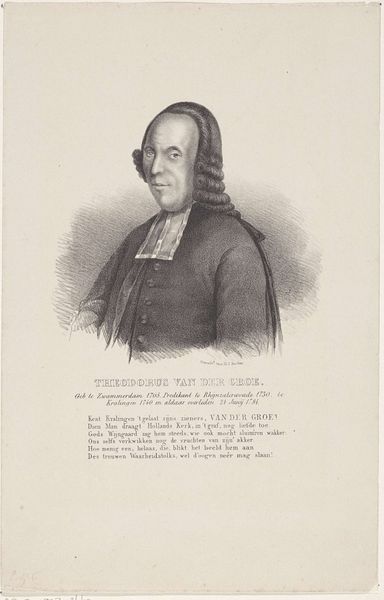 Editor: This is a lithograph from 1846 by Johan Daniel Ebersbach titled "Portret van Bartholomeus Theodorus Lublink Weddik," currently housed at the Rijksmuseum. I’m struck by its formal and rather austere feel, yet there's also something slightly unsettling about it. What stands out to you when you look at it? Curator: As a historian, what grabs my attention is the social context this portrait provides. Lithography, by the mid-19th century, was a relatively affordable method of printmaking. Consider how this medium allowed for a wider dissemination of images of public figures like Weddik. Who was he and what were the socio-political implications of distributing his portrait? Editor: It seems he was a clergyman. Does that affect your reading of the work? Curator: Absolutely. Think about the role of the church during this period. How did institutions shape the portrayal of their leaders, and how did the public consume those images? Was this portrait intended as a symbol of authority, piety, or something else entirely? Notice how the lithographic technique itself contributes to the portrait's overall message. Editor: I see your point about lithography influencing dissemination and messaging. The medium lends itself to a kind of formal accessibility, doesn't it? Almost like a campaign image. Curator: Exactly. The 'campaign image' concept resonates strongly when analyzing the socio-political intentions of the portrait, because this clergyman occupied a central position in the community’s power dynamic. So how might his image operate within a specific religious and cultural context? Consider, too, the influence of Romanticism in promoting certain ideals during that era. Editor: That's fascinating! I hadn’t considered how the social and political context influenced not only the subject but also the function of the portrait. I’m now wondering about how images like these reinforce social hierarchies. Curator: And that’s the crucial question to keep asking! Considering art as a reflection of – and a participant in – social and power dynamics offers valuable insight into any work.