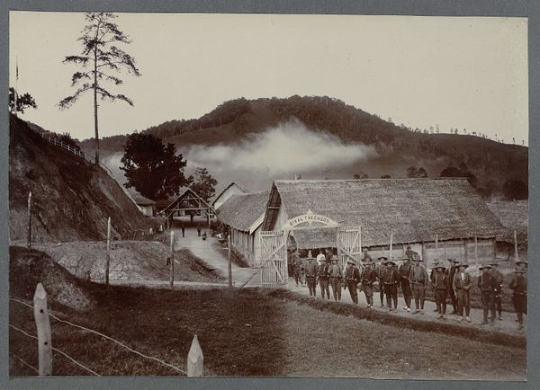 This vintage photograph captures a line of soldiers posing with their rifles in a vast, open field. A mountain looms in the background. Notice the stark contrast between the soldiers and the natural landscape, and how this arrangement speaks to a deeper symbolism. The line formation, replicated throughout history, is one of discipline, control, and the suppression of individual identity. One cannot help but think of ancient Roman legions, or even ceremonial military parades, which display power and order. The mountain itself, a symbol of permanence and strength, is contrasted with the temporary and transient nature of human conflict. Consider how landscapes, like the mountain here, can mirror the emotional states of its subjects, embodying the sublime, evoking both awe and a primal fear. The psychological impact of a group of soldiers is powerful; their gaze invites us to consider themes of war, duty, and the human cost of conflict. The mountain, in its eternal presence, stands as a silent witness. This symbol of conflict will continue to echo in the corridors of history, a timeless motif ever-reimagined.