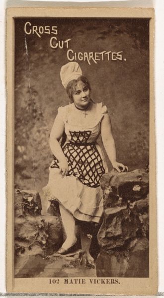 Curator: Let's take a closer look at this albumen print titled "Mlle. Darcelle," part of the Actors and Actresses series created by W. Duke, Sons & Co. sometime between 1890 and 1895. It's fascinating that this was originally a cigarette card! Editor: It’s charmingly old-timey! There’s a quiet melancholy about the figure of Mlle. Darcelle, with her feather plume and vaguely theatrical costume. She feels distant, almost dreamlike. Curator: The image operates on several levels. Initially, it's promotional material, meant to associate elegance and allure with Duke cigarettes. But beyond that, we have a document of a specific cultural moment, the cult of celebrity around performers. Editor: I imagine she was quite the star! Those cherries on her… corset, I think it is? Are definitely making a statement! The juxtaposition of such playful elements with her almost stern gaze is striking. What sort of character did she embody, I wonder? Curator: It's difficult to say for sure without further research into her stage roles. However, notice how her pose is carefully constructed—the way she’s seated, the slightly averted gaze. These choices lend her an air of sophistication and perhaps a touch of mystery, making her the ideal icon to associate with the aspirations of cigarette consumers. The photographic prints such as these played a powerful role in disseminating and controlling image. Editor: You are absolutely right. I see now that there are different signifiers carefully assembled to signal elegance. Even something like that velvet cloth under her hands is performing work of the high class. The way such commonplace things like tobacco can become intertwined with higher-level aspirations is a study of the era on its own. I wonder what became of her, and if she’d be at all amused knowing that she’s gracing the walls of a museum now! Curator: Yes, it gives one pause! In that sense, these images capture dreams and hopes of people more than a hundred years ago! Well, this was a marvelous discussion! Editor: Indeed! And now, for a smoke…or perhaps not.