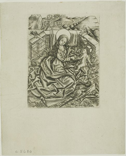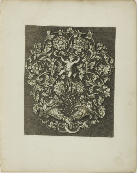 This is Felicien Rops' frontispiece for "Point de lendemain," a work made using etching. Rops was working in the late 19th century, a period marked by shifting social norms and burgeoning industrialization. The print presents a woman draped in fabric seated atop a chaotic swirl of figures and objects, caught between the pulls of the sacred and profane, represented by figures resembling angels and demons. Rops was part of the Symbolist movement, which sought to explore the darker, often repressed aspects of the human psyche. This piece encapsulates fin-de-siècle anxieties about morality, gender roles, and the perceived decadence of modern life. The artist challenges traditional representations of women, portraying them not as passive objects of beauty, but as complex figures embodying both allure and danger. The frontispiece acts as a mirror, reflecting the complex interplay between desire, morality, and the societal expectations that shape our understanding of identity. It invites us to confront the emotional and personal dimensions of these societal issues.