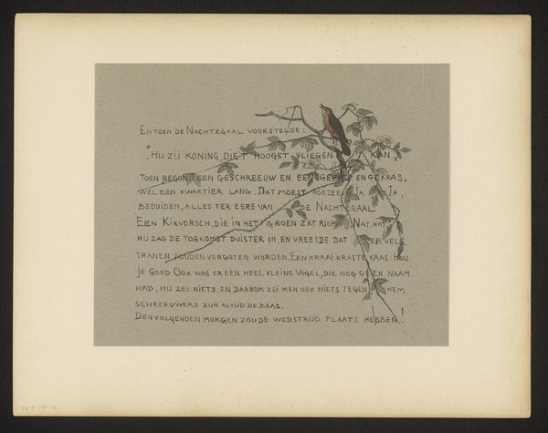 Curator: Editor: This piece is entitled "Tekstblad met diverse vogelsoorten bij het muizenhol waarin de winterkoning verdween," which translates to "Sheet with various bird species near the mouse hole in which the wren disappeared," created in 1892 by Theo van Hoytema. It's rendered in ink on paper and resides here at the Rijksmuseum. The grey and black color scheme gives it a somber mood. What draws your eye, initially? Curator: The composition compels me. Consider the stark linearity of the text contrasted with the meticulously detailed renderings of the avian figures. Notice also the geometric placement of these figures against the flat grey field. This piece engages with a dichotomy, doesn’t it? One between linguistic declaration and naturalistic representation. Is this disjunction successful, or does the arrangement fail to produce coherence? Editor: I see what you mean, with the geometric birds breaking from the text... but I’m still unsure if this creates cohesion within the drawing, rather than disjunction, as you state. Could it be the other way around? Curator: Perhaps cohesion arises paradoxically through discordance. Does the semiotic function of the avian figures override its narrative placement and its thematic concern with ornithology? Editor: That's insightful. The rigid lines of the text, the placement and geometry of the birds themselves. Everything down to their individual construction...It's interesting to think of these elements being in harmony from a more removed point of view. Curator: Precisely. Meaning then is derived through rigorous organization, independent of explicit subject matter. We uncover signification in this visual architecture. Editor: Right, a departure from what I initially understood based on just the piece's title and theme. Thank you!