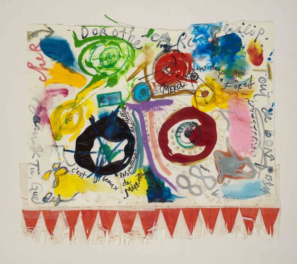 Editor: Here we have Friedel Dzubas's "Untitled," created in 1982 using pastel and watercolor. It’s rather playful; the colours and shapes give me a childlike wonder, even a feeling of something ancient. What kind of images come to mind for you when you look at it? Curator: It strikes me as a ritualistic object, perhaps a painted shield, maybe even an abstracted astrological chart, something that could be held and used. Do the colours carry symbolic weight, do you think? Editor: I hadn't considered symbolism beyond a gut feeling! The gold border seems to contain or protect the interior shapes... Curator: Indeed! And how might we interpret the placement of those vertical colour marks – like standing stones in some sacred site? Notice the rhythm they create, almost a song or a story. Do you feel a sense of place or narrative within this arrangement? Editor: Yes, now that you point it out! They do feel intentionally placed, and create a certain ordered, colourful pattern. And what about those three dark circles along the bottom? Curator: They echo, don't they, that inherent triadic structure that is resonant in various belief systems – past, present, future, or mind, body, spirit? Do these simple shapes begin to resemble any iconography or symbolism familiar to you? Editor: Not that I can pinpoint. Still, looking closer, it almost feels like the artist is drawing on some kind of deeply rooted, shared visual language. I feel like I’ve been granted permission to look closer. Curator: Dzubas seems to tap into that archetypal imagery, using abstraction to express something very profound and primordial. I learned that seeing the piece in such an objective way will allow one to extract symbolism without assigning concrete narrative, allowing for broader understanding.
