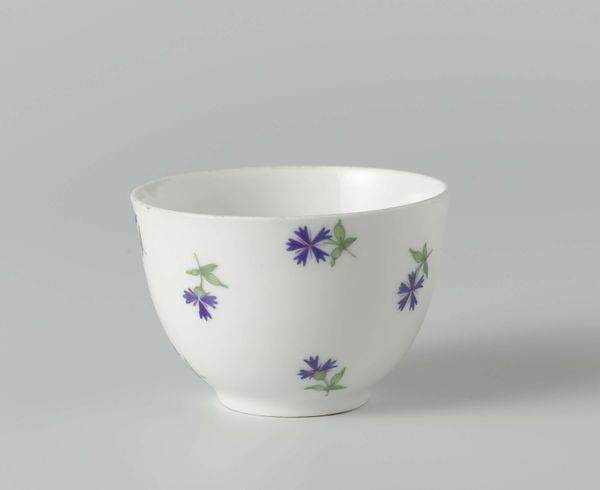 This small cup, made by an anonymous artist, presents a delicate interplay of form and surface design. Its simple, rounded shape is immediately appealing, its white body acting as a blank canvas for the floral decoration. The painted flowers, with their red, blue, and yellow hues, are distributed unevenly, creating a rhythm that leads the eye around the cup. The black outlines of the flowers and leaves provide a sharp contrast, delineating the forms and adding a graphic quality. The arrangement of the floral motifs, with their careful asymmetry, destabilizes any fixed or predictable reading. We see how the cup engages with ideas of functionality and ornamentation, tradition and innovation. It exists as an ongoing dialogue, an interplay of form and surface that invites endless interpretations.