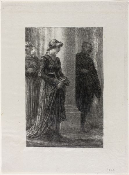 Théophile Alexandre Steinlen created "Le Mai d'Amour" using lithographic crayon and transfer paper. The somber tones and shadowed setting immediately establish a mood of introspection, perhaps even constraint. Notice how the arrangement of the three figures divides the composition into distinct, almost theatrical, panels. The artist uses line and shadow to create texture and depth. Steinlen challenges conventional representations by embedding the narrative in the formal elements of the artwork. The lack of bright colors or overt emotional displays suggests a critique of the romanticized and sometimes artificial constructs of love and courtship. The composition's structure invites viewers to ponder the underlying social and cultural forces shaping these women's lives and choices. Consider the interplay between light and dark. The darkness of the buildings contrasts with the women's faces, drawing our attention to their expressions. Steinlen subtly critiques the societal expectations and commodification of love. This lithograph functions as a complex commentary on the socio-economic conditions influencing individual experiences of love and freedom.