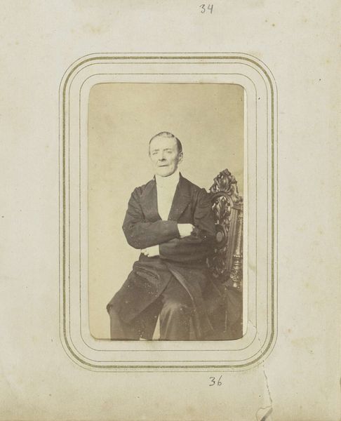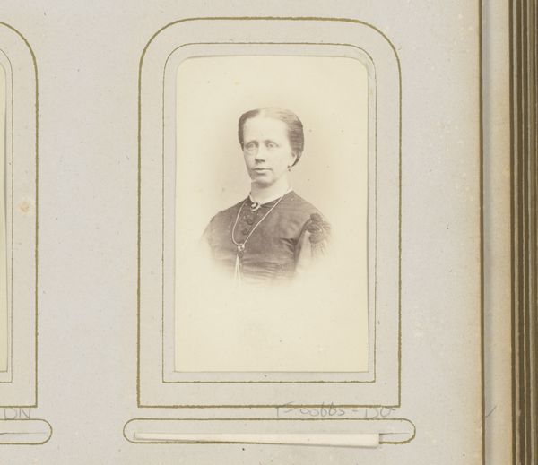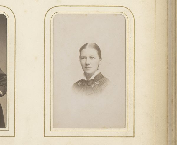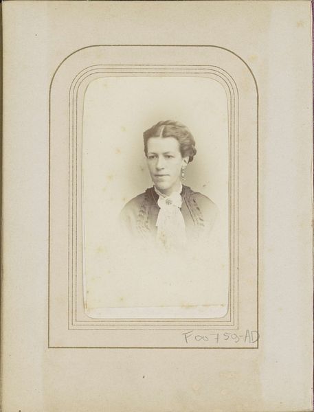 Curator: A rather solemn face stares back at us from this photograph entitled, "Portret van een vrouw met oorbellen," or "Portrait of a Woman with Earrings" by A. Dupont, dating back to around 1878. What are your first impressions? Editor: Austere and undeniably aged—you can almost smell the chemicals and feel the weight of the past embedded in this photographic print. The tones and framing definitely evoke a bygone era. Curator: Indeed. The composition directs our gaze squarely at the woman’s face, drawing attention to her expression. The almost symmetrical balance adds to the gravity of the piece. Editor: I am intrigued by how Dupont captured light, or rather the lack thereof, reflecting on the material possibilities of photographic art back then. This portrait offers insight into 19th-century photographic practices—the limitations and how those limitations informed artistic choices. The choice of toned paper also reflects material considerations and the period's aesthetic preferences, and maybe the availability of materials. Curator: From a formal perspective, the choice of light is deliberate, directing our eyes not only to her facial expression, but also to her social position, visible in the sartorial elements. This portrait isn't merely an attempt to capture likeness but also to create a composed statement. The delicate oorbellen and the formal attire work in tandem. Editor: Exactly. Considering the broader implications of portraiture during this period also is of consequence. Think about how this technology made representation accessible to a broader section of the population; who commissioned portraits versus who became a working photographer? And the very labor involved... Curator: Thank you. It makes us appreciate this artifact on display for us today and see it in a much richer way. Editor: Absolutely. By looking closely at these prints, we come to better understand the story about photography in the late 1800s and beyond.