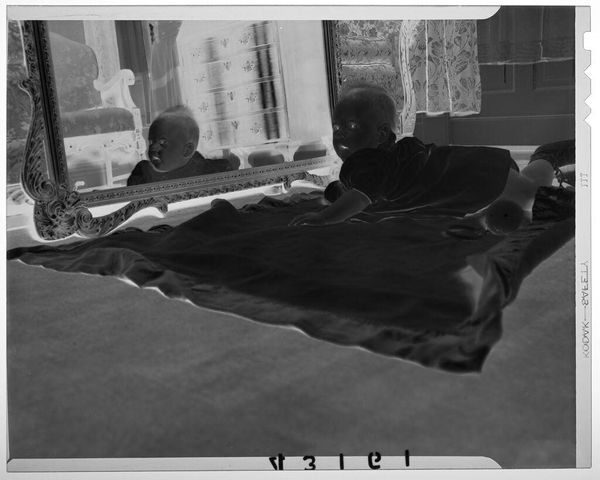 Editor: This photograph, "Untitled (man and woman sitting in chairs outside)" by Hamblin Studio shows a posed couple. The photo’s condition gives it such an eerie, almost ghostly quality. What’s your take on it? Curator: It's fascinating, isn't it? The damage to the negative becomes part of the story. I see fragility, both in the physical object and perhaps in the memory it holds. It reminds me that time and experience inevitably leave their mark. Editor: So, the imperfections add to the narrative? Curator: Precisely! It transforms a simple portrait into something much more poignant. What do you think it whispers about the relationship between the couple? Editor: Maybe a silent resilience, given the circumstances. It's definitely made me reconsider how I view damaged art. Curator: Wonderful! It's like the photo has been through a lot, just like the couple in it.