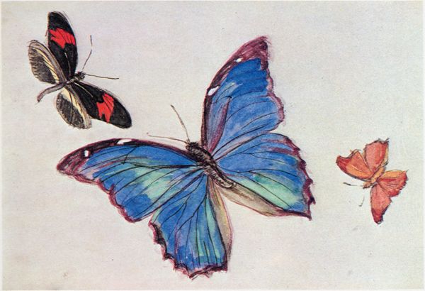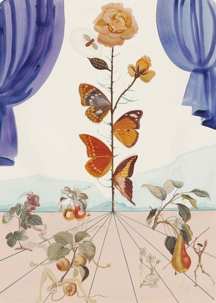 Editor: Here we have Salvador Dalí's "Allégorie de Soie," created in 1950 using watercolors. It's a rather peculiar composition; the butterflies are beautifully rendered, but the scene as a whole feels disjointed. How do you interpret this work, considering Dalí's famous surrealist style? Curator: Well, let’s look at the materials and process. Watercolors lend themselves to fluidity, a kind of immediate, almost ephemeral quality. Given the title – an “allegory of silk” – I see Dalí exploring the means by which something so delicate and luxurious is manufactured. Note how the linear perspective appears to radiate from that golden sphere – perhaps representing a silkworm's cocoon? How do these linear rays highlight that material and how might those butterflies represent the labor that created the silk. Editor: That's interesting. So you're suggesting the artwork connects to the material process of creating silk, almost like an industrial allegory hidden within a surreal landscape? I guess the classical elements contrast sharply with these flat perspective lines. Curator: Precisely. Consider also the fractured, almost industrial landscape surrounding the butterflies. Are they trapped by this silk structure? Or are the linear forms trapping the butterflies as their raw resources and material to support a woman's dress? What labor does she symbolize and consume? Dalí may well be inviting us to consider silk, not just as an aesthetic object, but as a product enmeshed within power structures of creation. What can a painting that presents an allegory, offer a perspective on exploitation through consumption of precious textiles and human labor? Editor: I never thought of it that way! It makes me think about how much the "exotic" fabrics and fashion depend on production and exploitation elsewhere. Curator: Exactly. And it shows how art, even surrealist art, is deeply rooted in material reality and social context. Editor: Well, I certainly see it with new eyes now. Thanks! Curator: My pleasure! Materiality often provides us with fresh starting points in any work of art.