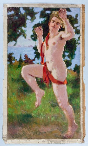 Curator: "Study for Wildlife. The man with the cluster," painted by Henri Matisse in 1905. It's an oil on canvas depicting a nude man in a landscape. I am immediately drawn to the use of vibrant colors. How do you read this artwork? Editor: It is hard for me not to see it in terms of traditional themes - harvest, the bounty of nature, an idealized human form… but, I don't know, something feels a bit off here, almost aggressive. Am I missing something? Curator: Focus on the materials. Notice the thick impasto and the way Matisse applies the paint. It's not blended smoothly. This directness disrupts any straightforward allegorical reading. How do these visible gestures of the hand impact the overall meaning for you? Editor: Well, I hadn’t thought of that exactly. So the brushstrokes and the way he uses oil paint, that itself carries meaning beyond just representation? I see what you mean – the raw application highlights the process of creation itself, pulling it away from idealization towards… labor? Curator: Exactly! And consider the social context. Matisse and his contemporaries were reacting against academic painting, questioning what constitutes 'high art.' This work challenges that by emphasizing the materiality of the medium, turning oil paint almost into a crafted substance. He’s pushing the boundaries, inviting us to reconsider the labor involved. Editor: So, it is as if the painting is about painting? He calls attention to the materiality of making an artwork. So I should think about the painting’s cultural production too? Curator: Precisely! It also shifts the focus from simply viewing to engaging with how the image came to exist in the first place. I mean, who harvested the materials needed for that canvas? What were working conditions like in the factories that processed oil-paint? Editor: I never considered all the levels of 'making' it involves! That's a perspective shift that completely alters my reading of the image. Thank you! Curator: Indeed, and that consideration allows us to truly appreciate the revolutionary aspect of Matisse’s work. It has opened up new possibilities of inquiry for me as well.