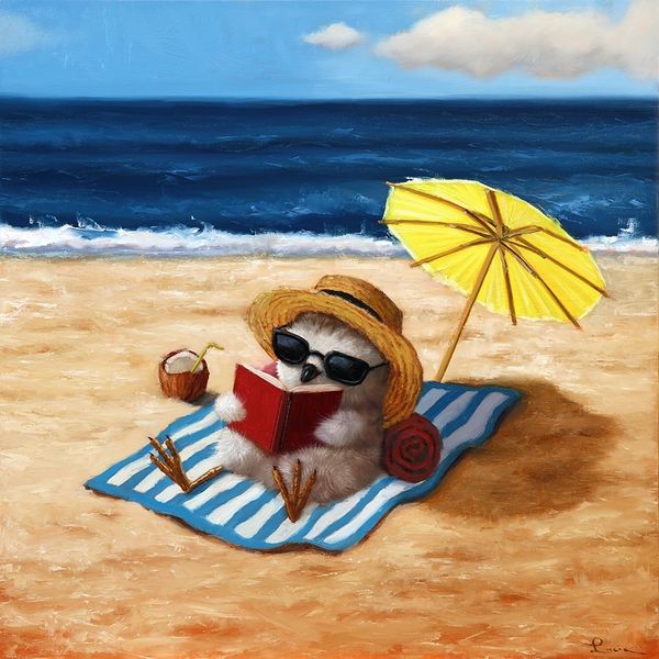 Lucia Heffernan painted "Aloha" without a specified date. The initial impression of this artwork is undeniably whimsical, dominated by the unusual image of a mouse dressed in a Hawaiian hula skirt, playing a ukulele on the beach. The artist has distributed the elements with calculated precision across the canvas. The composition is vertically oriented, with the mouse placed centrally and the elements of sand, sea, and sky layered horizontally. The use of color is striking; the mouse's soft brown fur contrasts against the vivid blue of the ocean and the bright pinks and greens of its lei and skirt. What's most intriguing here is how Heffernan toys with semiotic codes, mixing familiar signs – the mouse, the beach, the Hawaiian garb – to destabilize established meanings. The work challenges the viewer to reconsider their assumptions about representation and meaning. It operates as a site for playful interpretation, inviting us to ponder the cultural significance of such a peculiar juxtaposition.
