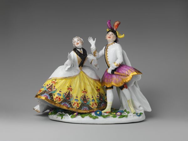 These porcelain figures, titled 'The Thrown Kiss,' were created by the Meissen Manufactory. The scene suggests a flirtatious exchange between a lady and a gentleman. Made in Germany, the figures reflect the 18th-century European fascination with Chinese aesthetics, visible in the man's robe. The Meissen factory was the first to discover the formula for hard-paste porcelain outside of China, giving it immense cultural and economic power. Porcelain became associated with wealth and aristocratic taste. 'The Thrown Kiss' speaks to the social rituals of the upper classes, like courtship, made all the more luxurious through their representation in such a costly material. To better understand these figures, we can research the history of the Meissen Manufactory, the social customs of 18th-century European aristocracy, and the trade routes that brought Chinese porcelain to Europe, shaping its visual culture. The meaning of art objects like these is always contingent on such social and institutional histories.