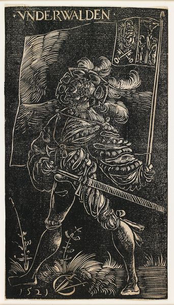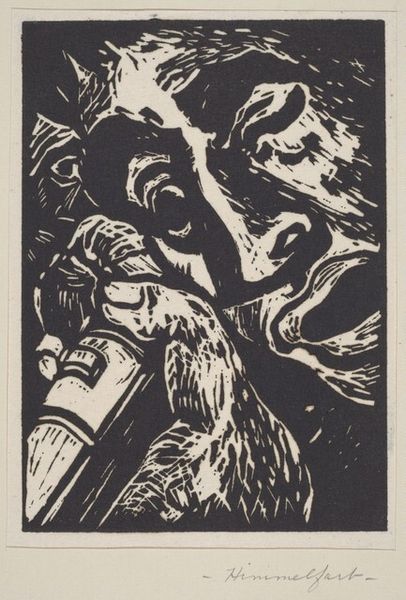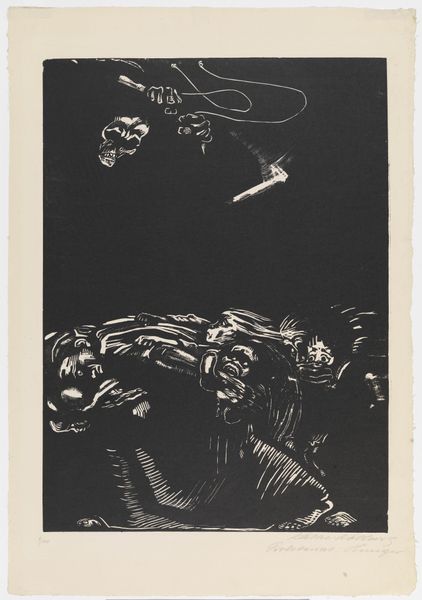 Curator: I am struck by the starkness of Herbert Bennett’s woodcut, "Untitled (Frustration)." It’s an explosion of black and white, of forms barely contained within the frame. Editor: Indeed, a powerful first impression. The high contrast grabs the eye immediately, a deliberate choice which makes the central figure seem to writhe under some immense pressure. Tell me more about the historical context of Bennett's practice. Curator: Bennett's prints from the Black Arts Movement often tackle social commentary. We see recurring visual articulations and a dedication to depicting raw emotion. "Frustration," though untitled, seems very clear. We are confronted with an African American man seemingly suffocating under… something. Editor: Let's delve into the semiotics. Notice the musculature—exaggerated, almost grotesque—is rendered with meticulous detail. Yet, it conveys not power, but strain, bordering on a breakdown. His posture, folded and tense, pushes against the limited space he occupies in the image, echoing this notion of containment. Curator: And note the tire. With "U.S. RUB[BER]" stamped into it, the implications seem pointed. Is the man trapped, burdened by American industry, capitalism, or the broader systemic forces at play in mid-century America? His face seems distorted, filled with a controlled rage. Editor: Precisely! It’s a confluence of textures and values, each element purposefully distorted to create a profound unease. It’s in the material’s manipulation: woodcut— inherently stark—to amplify this feeling. I’m most drawn to the patterned fabric. Is it wrapping around him, another constraint? Curator: Potentially. Consider also how Bennett, though dealing with weighty topics, left this piece without a specific title. Perhaps to allow viewers space to interpret and connect their own experiences of systemic frustration with the figure depicted? Or perhaps he thought the message self-evident. Editor: Whatever the case, he succeeded. Bennett used form and expression to craft something deeply affective. It clearly expresses the human consequences of sociopolitical dynamics, giving visual form to feelings of futility in a hostile environment. Curator: Absolutely. It's a demanding image. "Frustration," I suspect, remains ever relevant to today's cultural conversations, ensuring that it remains as affecting as it was decades ago.