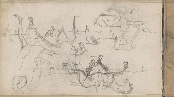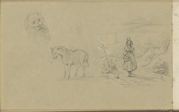 Curator: Let's turn our attention to this intriguing drawing by Johannes Tavenraat, titled "Studieblad, onder andere met twee biddende figuren bij een kruis," dating back to 1839. It resides here at the Rijksmuseum. Editor: It's immediately striking! A flurry of activity, or rather, studies of activity. The penmanship conveys a dynamic, restless energy. It feels…exploratory. Curator: Indeed. Tavenraat's composition reveals a careful arrangement of forms—note the distinct registers or planes of action, each contributing to an overall narrative quality, very characteristic of Romanticism. How does the interplay of light and shadow affect your perception? Editor: The ink work, especially its seeming lack of heavy layering or intense shadow play, speaks of either immediacy or…scarcity, doesn't it? A sketchbook quality hints at pragmatic choices by the artist. Were materials easily available? And how might that influence the final product's meaning? Curator: That's a very astute observation. Note the thematic organization by figuration; however, if you look closer at the praying figures by the cross you might perceive them as a unified expression of faith. The cross operates as the linchpin of this section. Editor: I'm drawn to the series of mounted figures sketched across the bottom. It suggests perhaps military exercise or a journey? What labor lay implicit in this social action—or simply put, what means of equestrianism were deployed? Curator: Precisely. Tavenraat synthesizes disparate elements: piety, landscape, and figural studies—and effectively combines these aspects into a singular artwork using minimal marks. The composition suggests narrative painting tradition. Editor: I appreciate how such modest materials can articulate broad thematic landscapes. Tavenraat, through basic tools and techniques, has transformed cheap paper and readily attainable ink into what appears to be deep feeling and keen, considered observation. Curator: A superb culmination of medium, expression and formal control into a romantic-infused sketch. Editor: Definitely an artwork where materiality adds depth of social commentary.