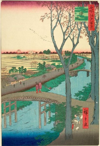 Curator: Here we have Utagawa Hiroshige's woodblock print, "Zoshigaya Fuji Mijaya", part of his series, "Thirty-six Views of Fuji." Editor: It’s lovely. There's such a delicate balance here between the intimate scene of women at leisure and the distant, almost ethereal presence of Mount Fuji. It feels peaceful, balanced. Curator: He was a master of ukiyo-e, capturing these fleeting moments. The meticulous carving of the woodblocks and layering of ink is fascinating. Consider the paper itself and the artistry required. Editor: I do. It all feels so carefully considered, down to the placement of each lantern. But it breathes, doesn't it? Like a captured memory, softened by time and beauty. It's a reminder to seek those moments of quiet contemplation, isn't it? Curator: Indeed. Hiroshige's work allows us to appreciate both the grandeur of nature and the small moments of human interaction within it.