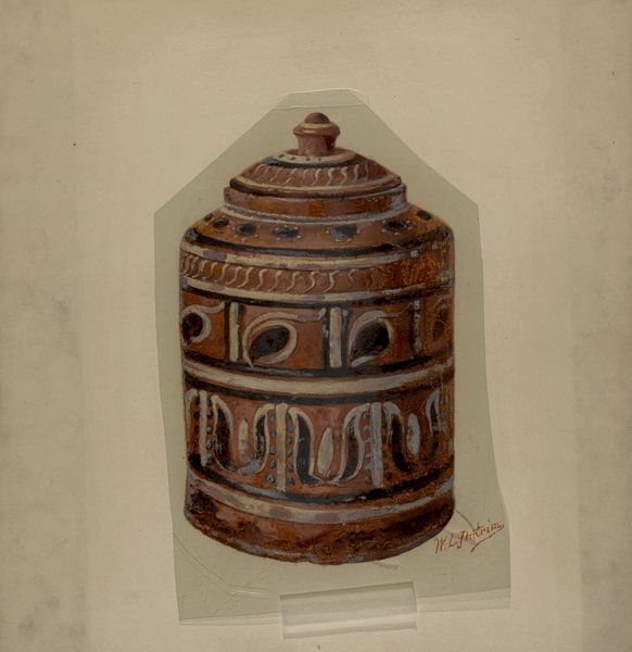Editor: This is Nicholas Amantea's "Decanter," a drawing made with ink and charcoal on paper, sometime between 1935 and 1942. It feels quite classical, yet the craftsmanship implied by the detailed design makes me curious. How do you interpret this work? Curator: It’s fascinating to consider the process behind this object, even as depicted in a drawing. A decanter speaks to rituals of consumption, particularly the serving and enjoyment of wine. Was this design intended for mass production? The level of detail suggests a desire to elevate a functional object to something more, perhaps as a symbol of status. What does the chosen material, whether glass or ceramic, signify about its intended user and market? Editor: That's a very interesting take, the labor that goes into manufacturing a decanter...and someone like Amantea taking the time to sketch this is telling. The materials matter! Does the drawing’s medium itself, ink and charcoal, inform how we should see its economic relevance? Curator: Absolutely! Think about the accessibility of these drawing materials in the mid-20th century. Was this design meant to be broadly available, or to appeal to a wealthier clientele who appreciated fine craftsmanship? Furthermore, considering it as a drawing, not the decanter itself, questions the original function as a vessel for wine. The drawing acts as a tool. What were they trying to sell with this design? And to whom? Editor: It's interesting to think of the drawing itself as a form of labor, contributing to the commodification of even simple pleasures. This has changed how I initially thought about it, from just an aesthetic exercise to a study in industrial and material history. Curator: Precisely! The art isn't simply in the object or its representation but embedded in the web of production, consumption, and the social values it embodies. Considering this I realize the implications that industrialization had on design, it transformed more labor intensive designs to fit streamlined manufacturing, I would be very curious to learn if this particular design ever saw a market.