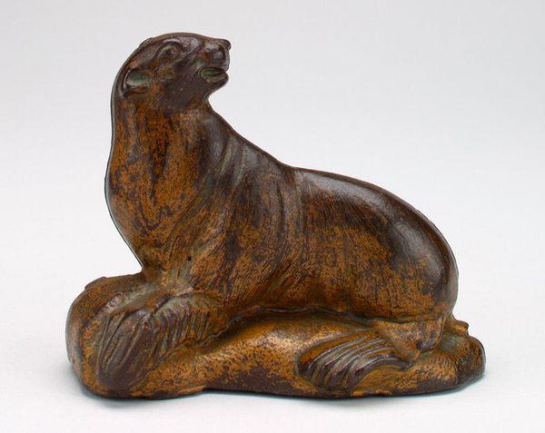 Editor: We're looking at Antoine Louis Barye's "Tiger Attacking a Peacock," a bronze sculpture at the Harvard Art Museums. The tiger’s lean musculature poised to strike is quite arresting. What do you see in the composition that I might be missing? Curator: The diagonal dynamism is quite effective. Barye’s masterful manipulation of bronze captures the raw energy of the tiger. Note the interplay of light and shadow across the textured surface; it amplifies the ferocity. Editor: It really does look ready to pounce. The texture certainly enhances that impression. Is there anything more to the design itself? Curator: The sculpture's design deliberately contrasts smooth and rough textures, highlighting the predator's power against its implied prey. It's a study in controlled tension and release. Editor: I see it now; that tension is palpable. Thanks for pointing that out. Curator: My pleasure. The formal elements speak volumes about the artist's intent.