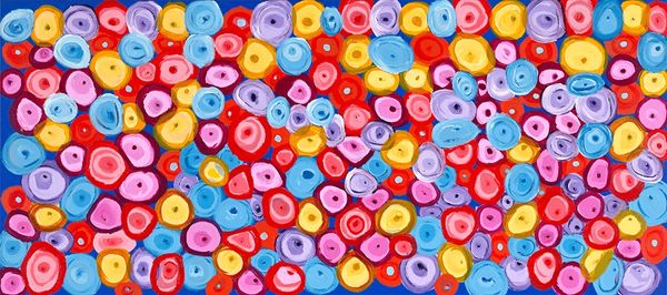 Editor: This is Takashi Murakami's "Jellyfish Eyes - White 1" from 2004, done in acrylic paint. The first thing I notice is the sheer density of shapes, this overwhelming field of eyes. How should we interpret this composition? Curator: Note how the overall impact relies upon repetition and variation. Observe how each ‘eye’ functions as a unit, a module if you will, and through chromatic and proportional adjustments, the artist constructs a field that oscillates between order and chaos. Consider the interplay between the individual components and the gestalt. Editor: That’s interesting. So, you’re seeing it more in terms of its structure and less as, say, a commentary on surveillance or something like that? Curator: Precisely. We can discuss context later, but, formally speaking, the artist manipulates the semiotic potential of the ‘eye’—its inherent symbolic baggage—through changes to the signifier itself: color, size, placement. To what effect, though? Are we looking at dynamic play, a harmonic field? Or are there more significant tensions at work here? Editor: I guess the variations in color and size keep it from being totally monotonous. It's almost playful. I see that the eyes aren’t consistently spaced, which creates some visual rhythm across the white canvas. Curator: Indeed. Notice how this patterned ground establishes internal relationships and echoes across the surface through the careful adjustments of chromatic intensity, proportional variation, and perspectival play. Editor: I now recognize I was quick to read "eyes," rather than appreciating how the image creates rhythm and variation within defined boundaries of pattern. Curator: Analyzing this painting as a system has opened my own eyes to the tensions created by small but numerous adjustments within the artist’s visual vocabulary.
