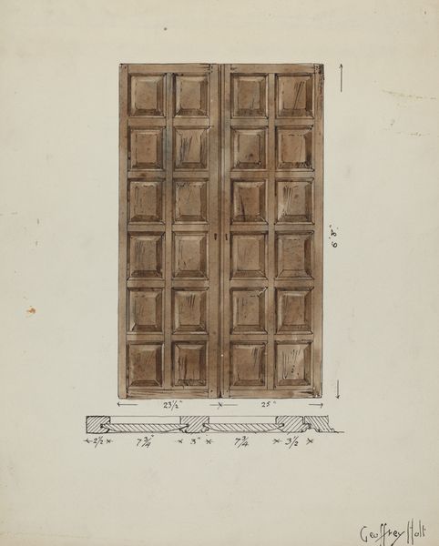 Curator: The quiet austerity of Geoffrey Holt’s “Old Paneled Door: Outside Door to Monastery” immediately strikes me. The tones are muted, almost melancholic, rendered simply in pencil on paper. Editor: Indeed, a rather hushed depiction. We see a precisely rendered drawing of a wooden door, circa 1936, delineated with some technical notes concerning dimensions along its borders. Holt's meticulous technique almost elevates a functional object to the level of a studied subject. Curator: The door, or what seems like the suggestion of it, implies transition and, perhaps, restricted access. We're faced with this barrier, composed of eight rectangular panels, equally proportioned. I see something of the eight-fold path towards enlightenment reflected in that configuration... Or perhaps that is reaching too far? Editor: Not necessarily! The formal organization could very well inspire reflective states, in part, by understanding the relationship between the material culture within a monastic context, in relationship to ideas and doctrines espoused within them. In any case, let’s look at what comprises the door itself. Its apparent aged character likely speaks to time and labor--consider the milling of the timber to create it. We only see one side here; one can't but wonder about what evidence the reverse bears? Curator: What echoes through time, yes. Though sketched so plainly in graphite, you feel a sense of reverence in this work; one is drawn to imagine those who might have passed through the portals this doorway represents. The door is presented to us directly, but what secrets lie on the other side? What experiences and untold histories do these panels contain? Editor: Its flatly lit surface betrays no narrative, though… Still, let's note its composition: an ordinary door's elevation and section--are presented plainly. It does beg to question the level to which Holt elevated his labor, both by making it visually appealing but functional as an elevation with notes. The artistic merit lies not only in how to create it from nothing or of thin air, but understanding what comprises of one already materially existent and common in everyday life. Curator: An ordinary door becomes something more by contemplating its significance. This exercise is compelling; its formal execution invites repeated observation as we reconsider monastic symbols and themes and imagine thresholds we can no longer approach or cross. Editor: Precisely--material and symbol woven together through careful artistic intention. A potent combination.