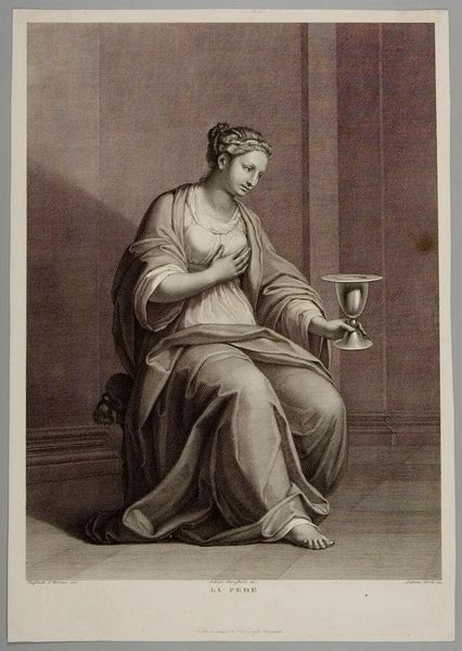 Curator: This is Carlo Pestrini's "Justice", held at the Harvard Art Museums. Editor: My first thought? That ostrich is the most anxious looking bird I've ever seen! The whole scene feels a bit staged, almost like a theatrical production. Curator: The presence of the ostrich is not accidental. During that time, the ostrich symbolized justice, truth and knowledge. Editor: Huh, learn something new every day. Still, it's a strange companion for Lady Justice, who looks quite serene holding her scales. The scales seem to have a calming effect, don't you agree? Curator: It's a powerful, albeit somewhat unusual, depiction of Justice. It speaks to the cultural values and symbolic language that were prevalent during its creation. Editor: Well, whether the ostrich is feeling anxious or not, it has me thinking about how we interpret justice in our own time. What symbols would we use today?