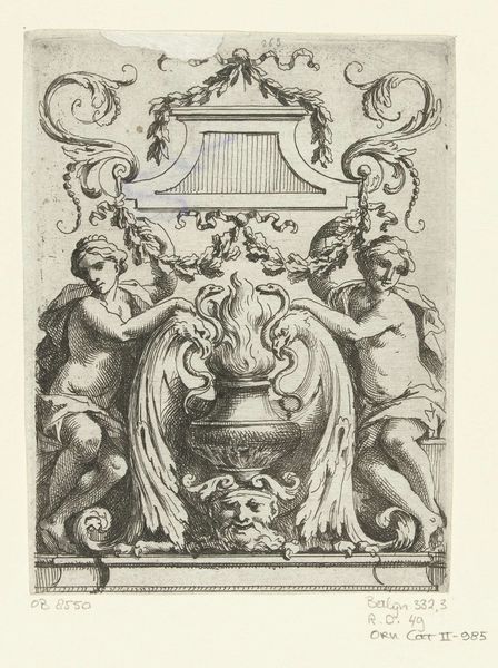 Editor: This is "Two Nymphs with Vase" by Nicolas Pierre Loir, created around 1660-1670. It's an engraving. The figures are really interesting, and I can’t help but focus on the sharp lines and the almost industrial look of the vase itself. What catches your eye in this piece? Curator: What interests me is how the means of producing this engraving reflect the social function of ornament in the Baroque period. Think about it: the engraving, a readily reproducible image, allows the spread of fashionable design, connecting artistic labor directly to patterns of consumption and display within aristocratic households. Editor: So, you're saying the *making* of the artwork, the fact that it's an engraving, is key to understanding it? Curator: Precisely! Look at the repetitive, almost mechanical lines used to create shading. This speaks to the workshop practice and the demand for ornament. It’s not just about aesthetic beauty, but about the economics and distribution of design. This redefines "art" beyond unique painting or sculpture and elevates printmaking, demonstrating its capacity to be integrated into daily lives. Editor: That's a different way of looking at it. I was so focused on the nymphs as allegorical figures, but what you're saying brings in the social implications of its production and consumption. Does this then change how we understand art from that period, given the division of labor involved? Curator: It challenges us to break down traditional hierarchies, yes. Who designed this? Who engraved it? How were these prints used? These questions lead us to understanding the broader economic structures in art. This engraving isn't just an image; it is part of a material network. Editor: That is truly a unique insight into the significance of printmaking as a method of mass production and consumption of art. Curator: Indeed, it's always a matter of revealing the interplay between the materials and its making in relation to people's lives and circumstances.
