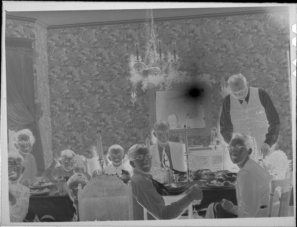 Editor: This photograph by Martin Schweig shows children opening presents while adults look on. It’s a small, black and white image, and there’s a stark contrast between the active children and the seated adults. What stands out to you in this piece? Curator: The generational divide is quite striking, isn't it? I see a representation of inherited wealth and leisure. Who benefits from this scene of consumerism? The adults, seemingly content in their roles, benefit from a system that allows for such displays of affluence, while the children are being trained into it. Editor: So, you see the photograph as a commentary on economic disparity and social roles? Curator: Precisely. The image speaks to the social construction of childhood, gender, and even race within the context of American consumer culture, wouldn't you agree? The photograph becomes a critical text, inviting us to examine the power dynamics at play. Editor: That’s a perspective I hadn't considered, thank you for sharing. Curator: It’s essential to consider these narratives, which can reveal deeper truths about our society and its values.