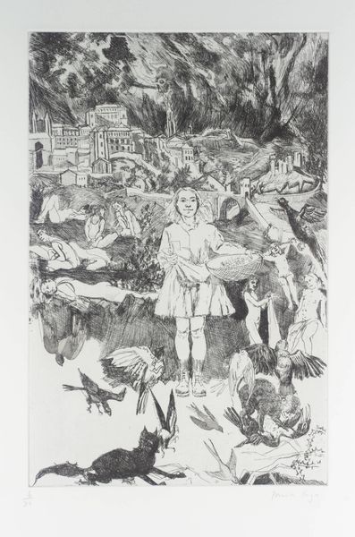 Neo Rauch made "HÜTER DER NACHT" with oil paint, though when exactly, I couldn't tell you. What strikes me is the way Rauch fearlessly mashes up different pictorial languages. Look at the figure with the drum – the way it's rendered is so different from the guy in the tracksuit! It’s like flipping through channels between old master painting and something more graphic, maybe even comic book-y. I like how the paint handles the textures, not just in the figures, but in the landscapes too. The way the brushstrokes build up the forms and how those yellow flowers kind of vibrate against the muted blues and greens. Then, there’s this weird kind of logic happening. Nothing makes sense, but it all feels like it has a reason for being there. It’s a reminder that art, at its best, is a conversation between what we see and what we feel, leaving us with more questions than answers, and that’s okay. Like a dream you can't quite explain.