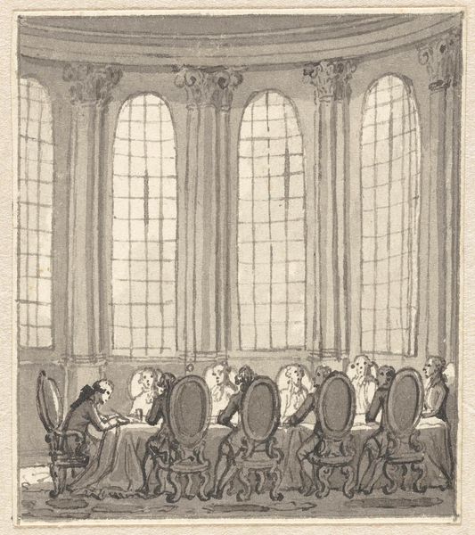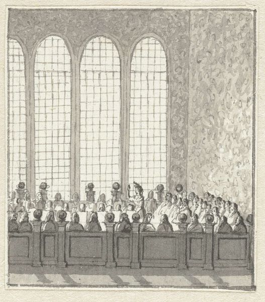Editor: Here we have Jacobus Buys’ pen and ink drawing, "Promotie met de kap te Leiden ter gelegenheid van het tweede eeuwfeest van de Universiteit, 9 februari 1775." Quite a mouthful! It's currently held at the Rijksmuseum. It really captures a sense of bustling academic life, even if it's monochrome. What strikes me is the almost theatrical setup, the way the figures are arranged. What do you see in this piece, looking at it with more experienced eyes? Curator: Oh, it’s so much more than just documentation, isn’t it? You feel the importance of the ritual. Buys manages to convey both the grand, ceremonial atmosphere, and the almost absurd humor of tradition. Those robes, those hats! The slight sketchiness adds a certain frantic energy. Have you ever considered what the ‘kap’—the doctoral hood—symbolizes in such a rigid academic setting? Almost like a coronation of intellect, wouldn’t you say? Editor: It's interesting that you call it absurd, almost humorous. I was mostly focused on the formality of the scene. That hood like a crown – yes, I suppose that ritualization also marks the beginning of another sort of service for the university and the nation! But why did the artist pick this specific moment? Curator: It was a grand moment. Universities held an almost mythical status then, launching pads of enlightenment. A bicentennial—200 years of scholarly dedication—deserves some visual celebration, eh? Imagine the pressure on the graduating doctor as the hood is placed – years of study culminating in *this*. It’s grand, historic, and strangely comical. Editor: I suppose now I can see that slight absurdity you mentioned, amidst all the pomp. It definitely offers a new perspective on how tradition and individual achievement play off each other. Curator: Precisely! That tension – between rigid formality and human aspiration – that's the spark that brings historical moments alive. Each drawing stroke of Buys is part of that narrative, isn’t it? A reminder to consider the spirit animating tradition.