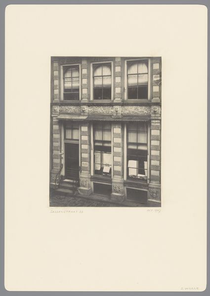 This is an anonymous photograph of Façade van Sassenstraat 33 in Zwolle, offering a direct look at a specific place and time. The photograph, with its monochromatic palette, presents the building's facade as a study in texture and light. I'm drawn to the way the light plays across the architectural details, emphasizing the ornamentation around the windows and the lettering, it's like the photographer wanted to focus on the building's character. The surface has a tactile quality, almost inviting us to reach out and trace the lines of the brickwork and the decorative elements. It reminds me of the way Agnes Martin creates space through the repetition of lines, its not the same but it feels adjacent. The photograph, in its simplicity, becomes a quiet exploration of form and surface. Like all art, it is an ongoing conversation with what has come before.