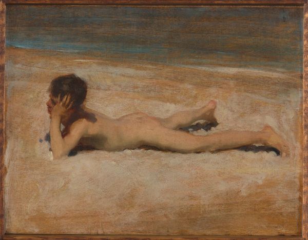 "Naked Boy" (1878) by James Ensor (1860-1949) is a striking realist study in oil on canvas, featuring a young male figure in a seated pose. The subject, rendered in meticulous detail, appears to be a young boy or adolescent, seated with his legs stretched out before him. The figure's nudity and the simple composition draw attention to the form and the artist's masterful use of light and shadow. The artist's brushstrokes are visible, creating a sense of texture and depth. This work reflects Ensor's early artistic development and his interest in exploring the human form with both realism and a certain degree of emotional intensity.