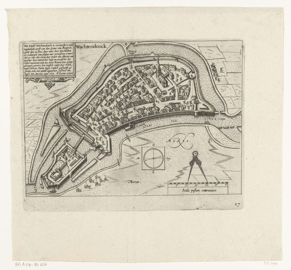 Editor: So, here we have "Plattegrond van Medemblik," an etching made around 1632 by an anonymous artist. It’s fascinating to see this overhead view of the city, but what strikes me most is how it seems to blend practical cartography with, almost, an idealized portrait of Medemblik. What do you make of this combination? Curator: That's an excellent observation. Consider that this wasn’t just about recording geographical data. In the 17th century, cityscapes like these functioned as visual representations of civic pride and power. Note how prominently the Zuiderzee is depicted. The Dutch Golden Age was fundamentally shaped by maritime trade. Wouldn't you agree that positioning Medemblik in relation to this sea reinforces the town's economic and strategic importance? Editor: Absolutely. So it's a subtle assertion of control, both literally over the land, and metaphorically, through its portrayal in art. The strategic angle makes a lot of sense. I didn’t consider it to be symbolic, only informational! Curator: Precisely. And notice the uniformity presented within the city itself, suggesting order and prosperity. Think about how these images were consumed; wealthy merchants and city officials likely purchased these to display their investment in and control of the space. Does knowing this influence your reading of the image? Editor: Definitely. Knowing that it wasn't intended for just informational purposes, but almost as propaganda, opens it up for a much deeper critical reading of Dutch power and societal structures at the time. Curator: Exactly. Maps like these reveal far more than just streets and buildings; they reflect the values and aspirations of the society that created them. Editor: This has really shifted how I view historical images - seeing them as tools of influence rather than just documentation. Curator: And understanding this allows us to delve deeper into the relationship between art, power, and societal ambition during the Dutch Golden Age.