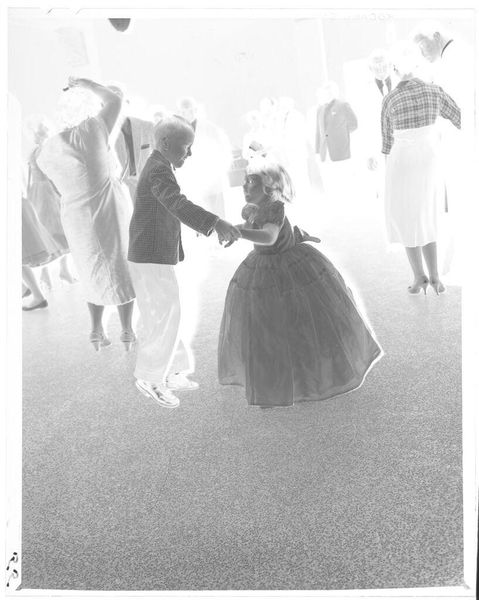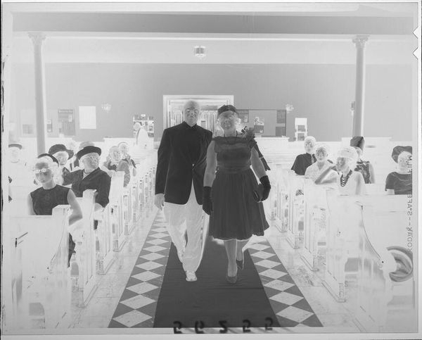 Curator: This is an intriguing image by John Deusing, simply titled, "Untitled (boy and girl walking down aisle)." It's a 5x4 inch gelatin silver print housed here at the Harvard Art Museums. Editor: It evokes a sense of solemnity, almost a gothic sensibility with its stark contrasts and rigid figures. They seem dwarfed by the architecture. Curator: These children are dressed formally, likely for a wedding. The boy is in a suit, the girl in a frilly dress and hat. The aisle suggests a performative space, mirroring societal expectations. Editor: Exactly. Look at the girl's elaborate dress; it's almost a costume. The image speaks to the constructed nature of childhood innocence within these institutions. Curator: Yes, and Deusing's choice of capturing what seems like a private moment within a public ritual raises questions about display and access within social structures. Editor: It reminds us that even seemingly innocent moments are saturated with power dynamics and performative identities. A useful reflection.