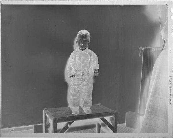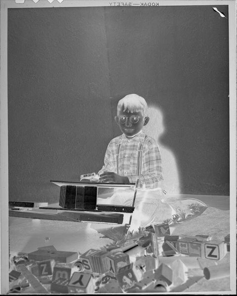 Curator: This intriguing photograph, simply titled "Untitled (baby with stuffed animal)" is credited to Lucian and Mary Brown. Its dimensions are quite intimate, only about 5 by 4 inches. Editor: It's a bit eerie, isn’t it? The inverted tones give it such a ghostly quality, like a forgotten dream. Curator: Indeed. The reversed tonality alters our perception and prompts us to reconsider the cultural significance of childhood and innocence, especially within the context of photographic representation. Editor: I keep wondering about the choice to invert it. Was it intentional or just a technical quirk? It makes the child seem almost otherworldly, holding these toy-totems, like a tiny shaman. Curator: That's an insightful point. This disruption of expectations invites us to question our assumptions about the archive and the power dynamics inherent in image-making, particularly concerning marginalized communities. Editor: It's hauntingly beautiful, in a way. I can't shake this feeling of melancholic tenderness looking at it. Curator: Precisely. It's a powerful work that challenges us to consider the complexities of representation and memory.