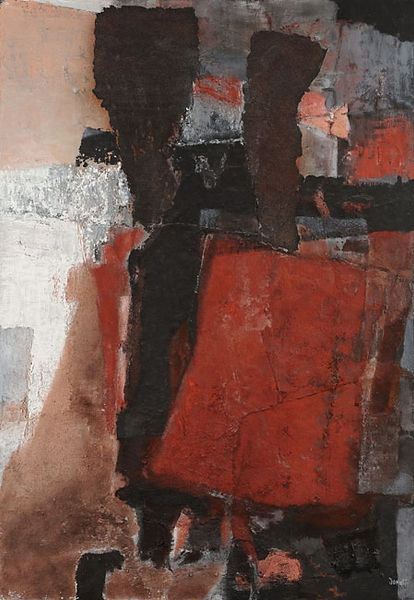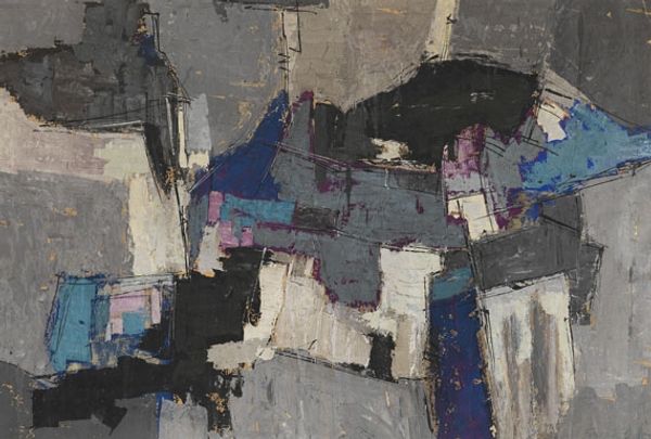 Editor: Enrico Donati's "Time Exposure," created in 1957 using oil paint, really strikes me with its textured surface and somber, almost industrial palette. What catches your eye in this piece? Curator: Well, first I look at the physical process. See how the materiality of the paint is emphasized? The thick impasto isn't just about aesthetics. It embodies the artist's physical engagement with the materials, a real labor of applying paint. Editor: I see what you mean. It’s almost sculptural, the way the paint is built up. Curator: Exactly. Consider the post-war context, too. Matter painting, like this, really challenged traditional notions of painting, rejecting illusionism and emphasizing the raw, tangible nature of the materials themselves. This resonates with broader social changes: valuing the labour involved in artistic production. Editor: So, it's about drawing attention to the ‘making’ of the painting, not just what it represents? Curator: Precisely. Look at the colors – grays, browns, a little red. These aren't traditionally ‘beautiful’ in a conventional sense. Donati isn’t trying to create a pretty picture; he’s investigating materiality. And those textures? The history of its creation are captured through the texture alone. Editor: It almost feels…honest? Raw, maybe? Curator: It is an honest use of oil, revealing its own history, the labor, in each stroke. This painting embodies a shift away from representational ideals, focusing instead on the physical and conceptual potential inherent in artmaking. Do you see the value now, how art material moves away from only making, to challenging a system? Editor: I do! Thinking about the materials and labor really shifts my perspective. It is less about just seeing, but understanding the painting's making. Curator: Absolutely. Looking beyond the surface of materials brings a new awareness.